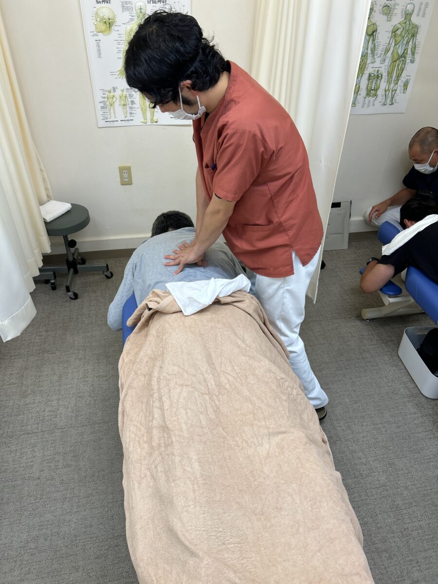 施術では、背部の痛みの中でも特にポイントとなっている肩甲骨に関連する筋肉をゆるめていくことで硬くなっていた胸椎の動きも楽になるように行いました。