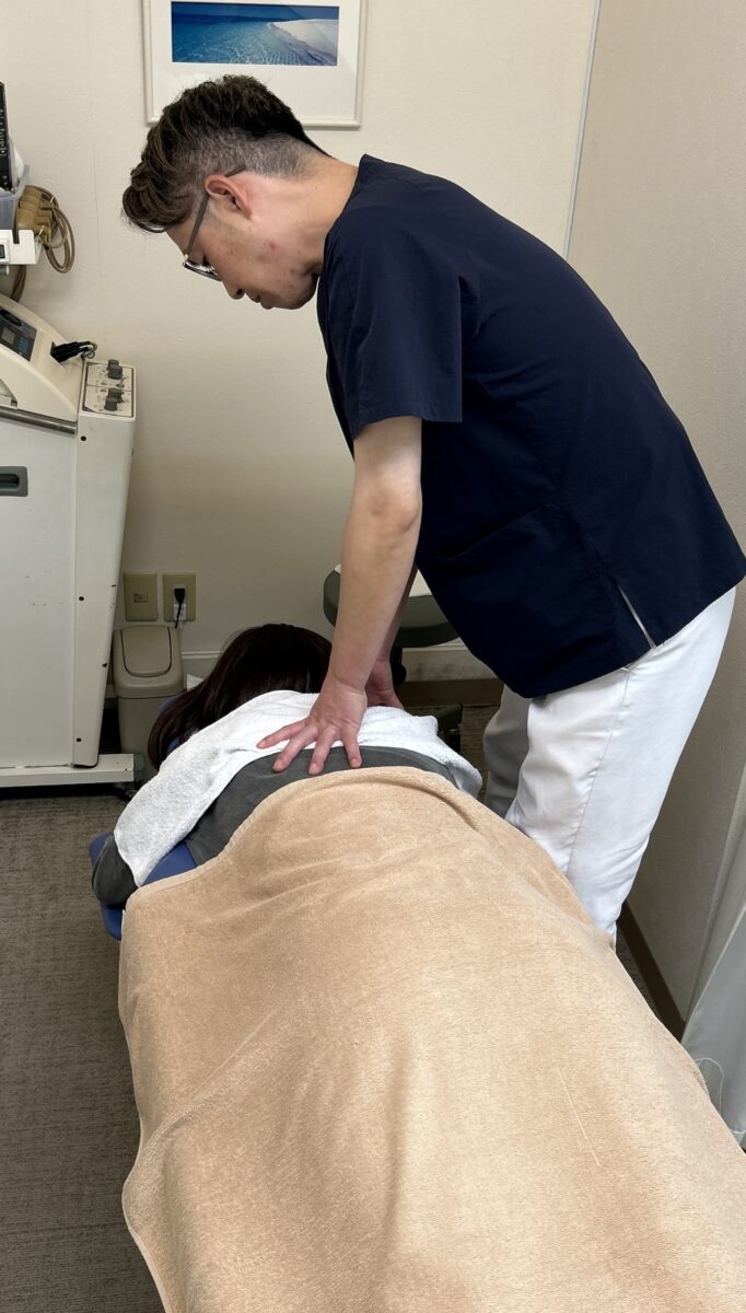 施術では、首そのものを強く動かすのではなく、胸椎や背中の動きを取り戻すことを中心に行いました。