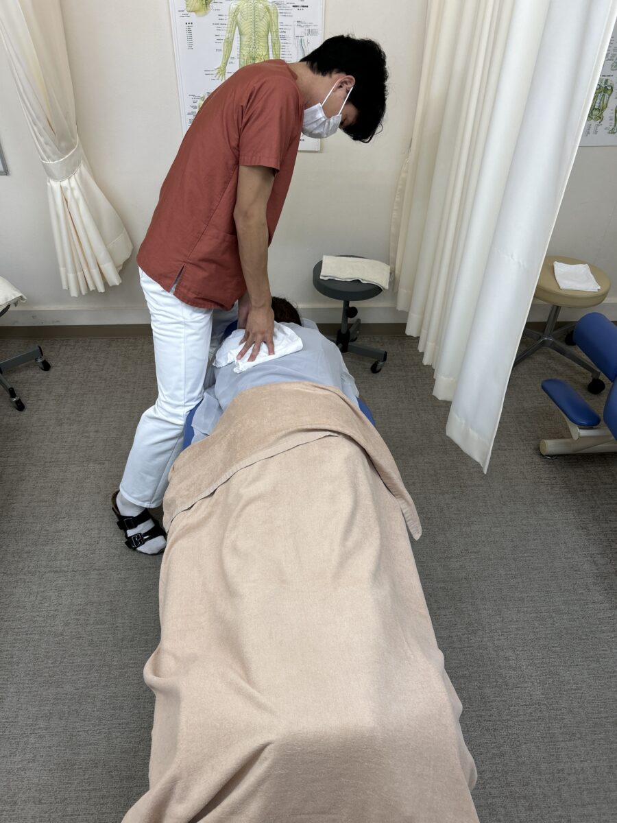 施術では腰周りの筋肉を緩めるだけでなく後弯している腰椎自体の動きが少ないので、腰椎に対して関節の調整を加えながら腰の改善を図りました。